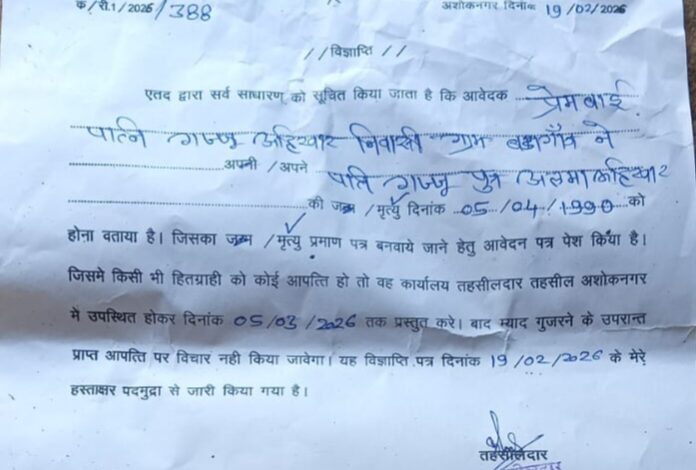 अशोक नगर/MP:- एतद् द्वारा सर्वसाधारण को सूचित किया जाता है कि आवेदिका श्रीमती प्रेमबाई पत्नी गज्जू अहिरवार, निवासी ग्राम बड़ागाँव द्वारा आवेदन प्रस्तुत कर बताया गया है कि उनके पति स्वर्गीय श्री गज्जू पुत्र अलमा की मृत्यु दिनांक 05/04/1990 को हो चुकी है।